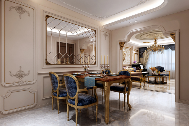 餐桌和餐椅均為金色色,表面略帶雕花,配合扶手和椅腿的弧形曲度,顯得優(yōu)雅矜貴,而在深藍(lán)色的卷草紋窗簾、水晶吊燈的搭配下,浪漫清新之感撲面而來。