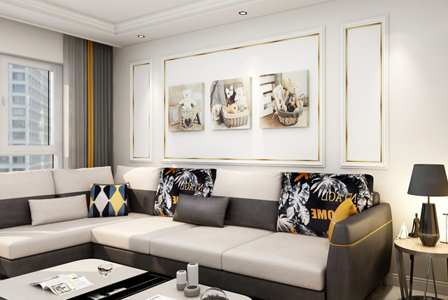 客廳大面積的白色墻底,金色線條營造高級(jí)而內(nèi)斂的空間基調(diào),主沙發(fā)的白灰色系是屋主非常喜歡的顏色,更好的凸顯沙發(fā)的色質(zhì)。