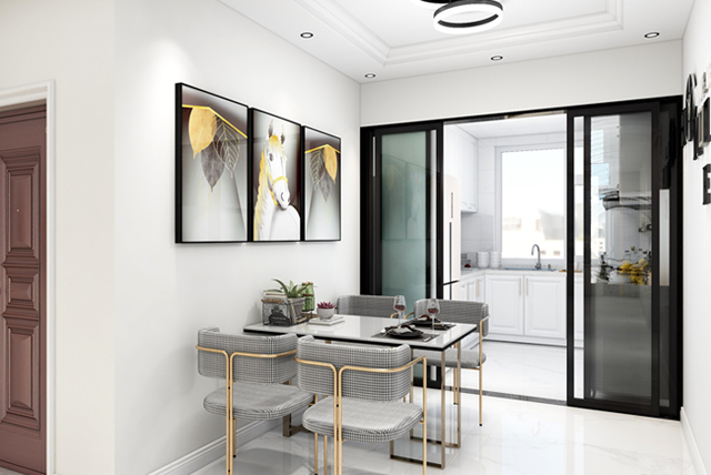 餐廳空間視野開闊,與客廳動(dòng)線緊密聯(lián)系,為了使兩個(gè)空間色彩不要過于單調(diào),餐廳墻面放置著組合裝飾畫,增添了空間趣味感。細(xì)節(jié)處的小設(shè)計(jì),讓簡單的生活充滿儀式感。