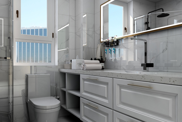 主臥衛(wèi)生間區(qū)域?yàn)槲葜鞔蛟斐鲎盍鲿车脑缙鹣词?dòng)線,水磨石瓷磚搭配乳白柜體,簡潔明凈。